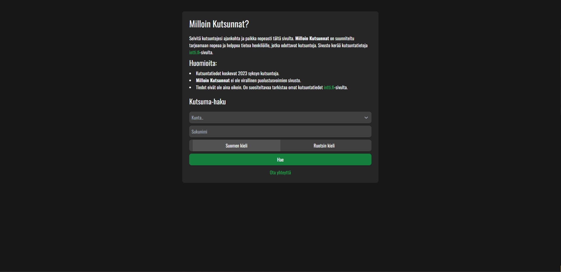 Millonkutsunnat.fi is a website that offers users a fast and convenient way to check their draft dates in Finland. It employs a Python OCR script to extract and index draft dates from PDF files provided by Puolustusvoimat. This data is then made searchable through a clean and simple Next.js web app.